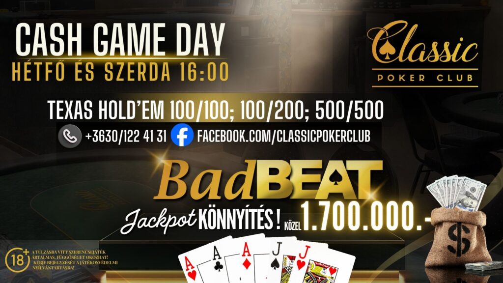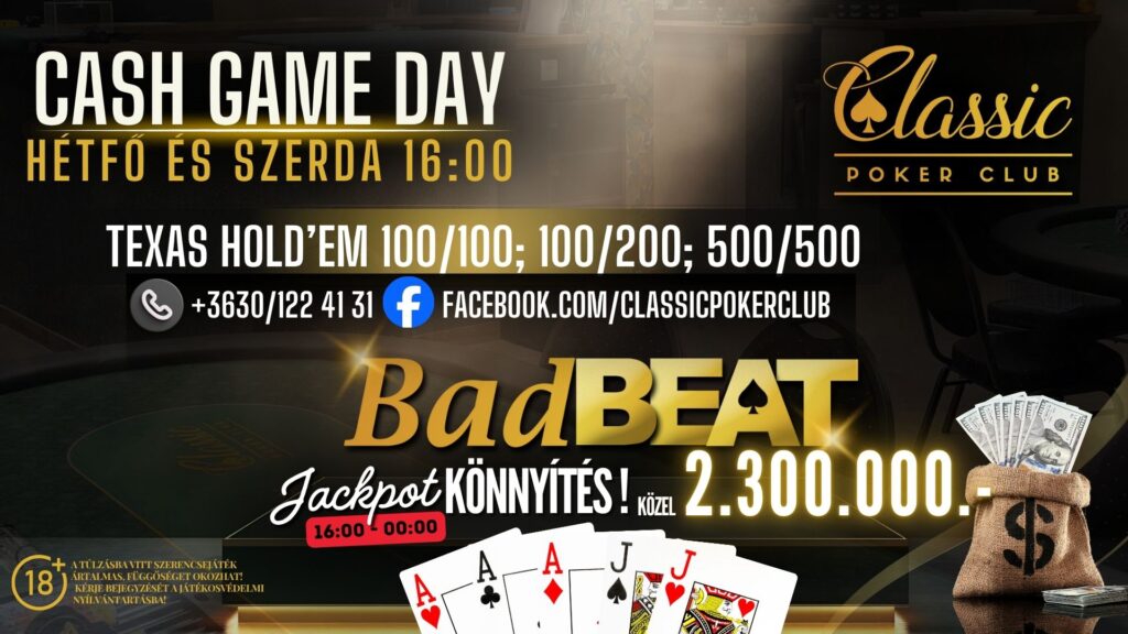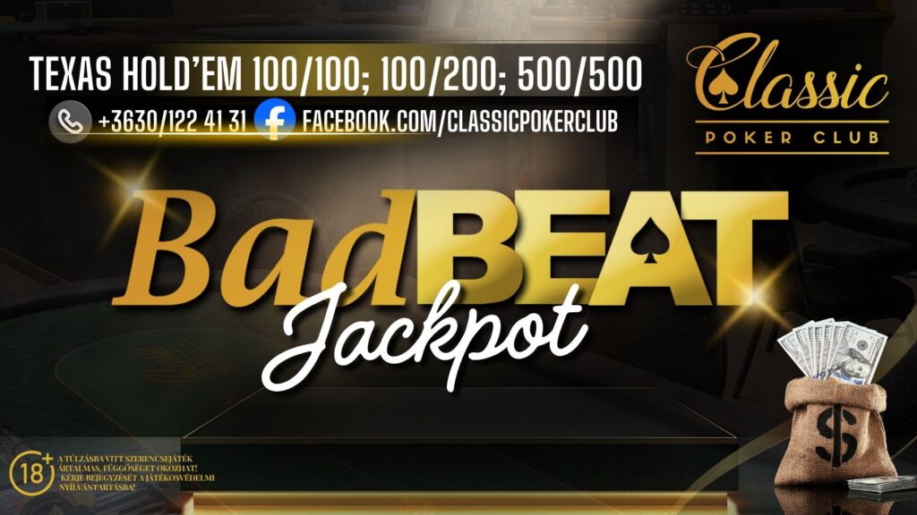 A Classic Poker Club legnagyobb Jackpot nyereménye bármely tétű Texas Hold’em Cash Game asztalunkon megnyerhető, egy minimum 8-as póker erősségű lapkombinációval elért vesztes kézzel. ( BAD BEAT KÖNNYÍTÉS esetén az előre meghatározott lapkombinációval)